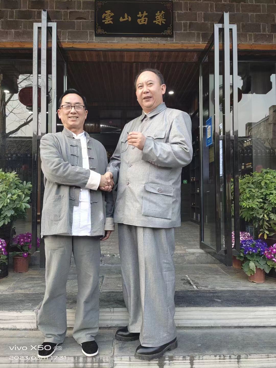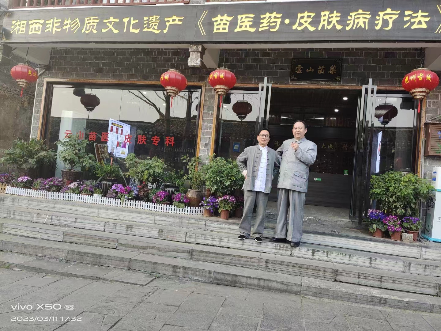 韶山毛氏后辈毛新群(特型演员)在吉首乾州古城(云山苗药)门诊前与苗医师合影留念